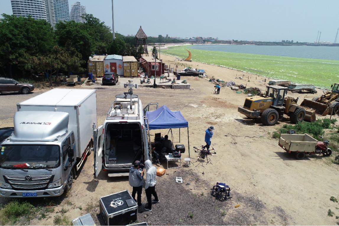 技術中心在前期調研,充分了解滸苔漂移及分布情況基礎上,迅速組織了9名技術人員,攜帶4架旋翼無人機,搭載可見光相機、攝像機和多光譜相機,對海陽老龍頭、乳山銀灘及東部海岸區域進行了無人機航拍,并通過移動監控指揮車實現了視頻實時回傳,進行數據快速處理,獲取了近岸滸苔災害態勢信息,共累計飛行12架次,監測面積約4平方公里。