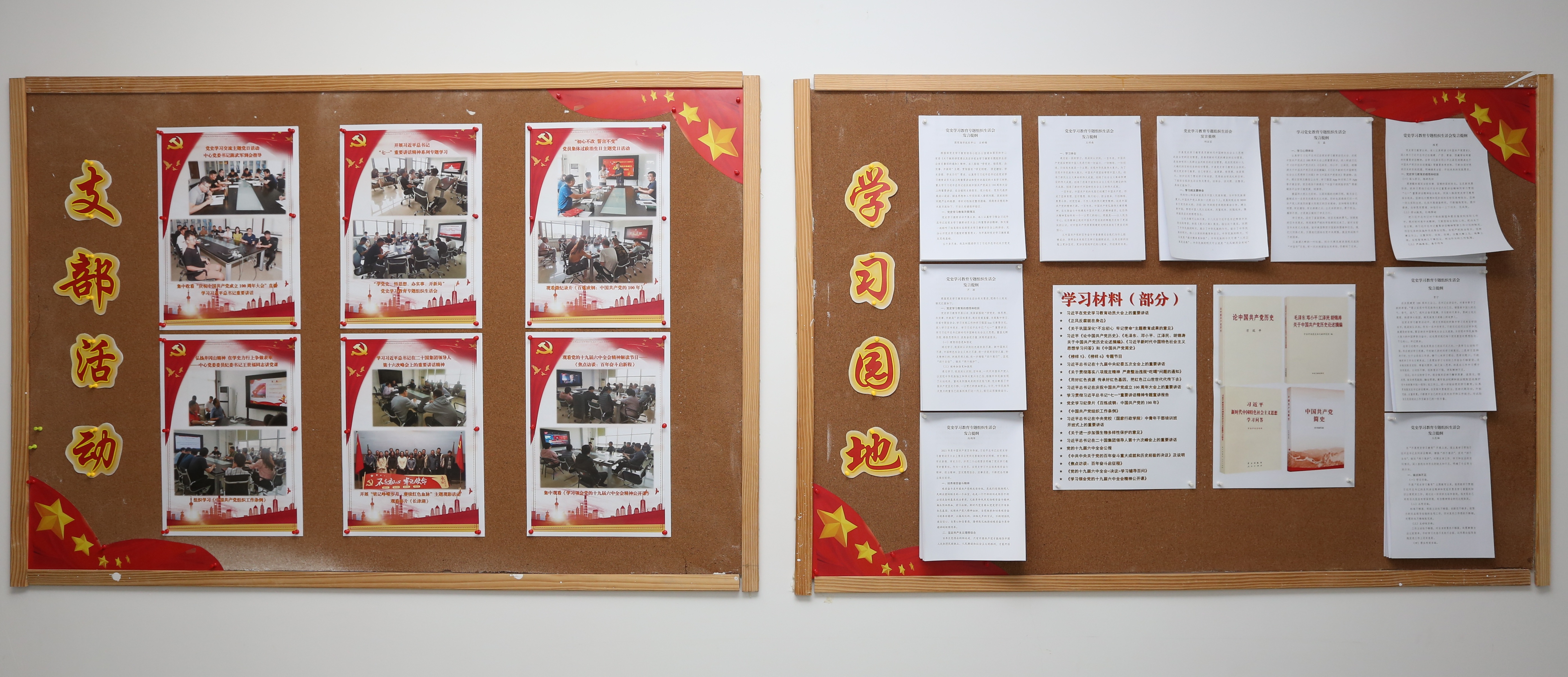 展板集教育性和展示性于一體,設計巧妙、內容豐富,包括“黨史學習教育”、“全會精神學習”、“支部活動”和“學習園地”四個板塊。“黨史學習教育”板塊圖文并茂,展現了建黨百年歷程中的部分重大事件以及關于“學史”重要意義的闡述;“全會精神學習”板塊系統展示了《中共中央關于黨的百年奮斗重大成就和歷史經驗的決議》的學習要點,宣傳黨的十九屆六中全會精神;“支部活動”板塊集中展示了支部成立以來組織開展的集中學習、專題交流、黨課以及主題黨日活動等;“學習園地”展示了支部部分學習材料以及全體黨員的黨史學習心得,反映黨員學習效果。