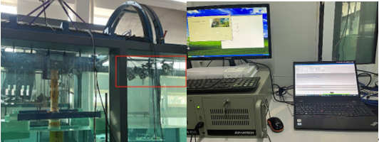圖2 非接觸式六自由度測(cè)量?jī)x(左)與造波、造流及數(shù)據(jù)采集系統(tǒng)(右)
