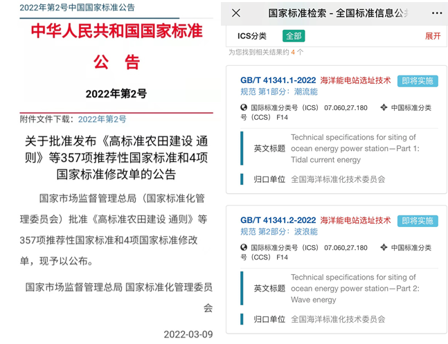 業(yè)務(wù)工作2022年3月9日,經(jīng)國家市場監(jiān)督管理總局、國家標(biāo)準(zhǔn)化管理委員會批準(zhǔn),由我中心承擔(dān)的《海洋能電站選址技術(shù)規(guī)范 第1部分:潮流能》(GB/T 41341.1-2022)和《海洋能電站選址技術(shù)規(guī)范 第2部分:波浪能》(GB/T 41341.2-2022)2項(xiàng)國家標(biāo)準(zhǔn)正式發(fā)布實(shí)施?!兑?guī)范》確立了海洋能電站的選址內(nèi)容、技術(shù)要求與數(shù)據(jù)資料、選址過程與方法,規(guī)定了潮流能電站的選址內(nèi)容、技術(shù)要求與數(shù)據(jù)資料、選址過程與方法和選址報(bào)告編制的要求,是指導(dǎo)我國海洋能電站選址的基礎(chǔ)性標(biāo)準(zhǔn)?!兑?guī)范》的正式實(shí)施將為潮流能和波浪能電站選址技術(shù)提供支撐和依據(jù),研制海洋能電站選址技術(shù)規(guī)范,規(guī)范海洋能發(fā)電站計(jì)算方法,是大規(guī)模開發(fā)利用海洋能資源的重要技術(shù)保障。(海洋能發(fā)展中心 吳國偉)