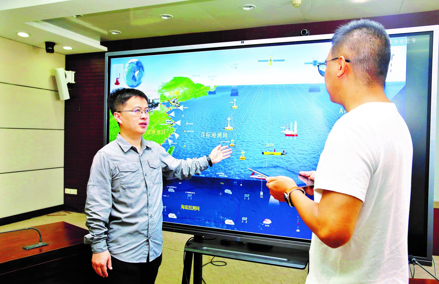 王祎(左)與課題組同事研討海洋觀測裝備規劃部署 侯權宇/攝