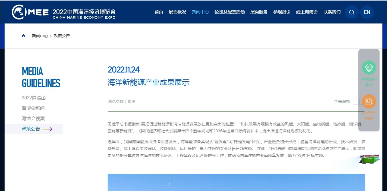 11月24日,海洋新能源產業成果展示網頁正式上線2022中國海洋經濟博覽會官網首頁。該網頁重點展示了黨的十八大以來,我國海洋新能源領域在技術創新、裝備制造、公共服務平臺建設等方面取得的成果。