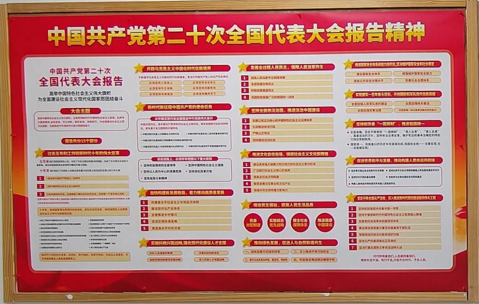 學習宣傳貫徹黨的二十大精神是當前和今后一個時期全黨全國的首要政治任務。展板設置了“中國共產黨第二十次全國代表大會報告精神”專題板塊,宣傳大會主題和報告15部分主要內容。