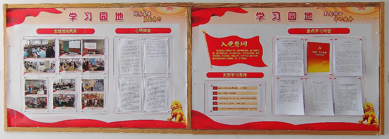 為深化學習教育、展示支部風采、反映黨員學習效果,展板設置了“學習園地”主題板塊,展示了支部的學習安排和重點學習內容,張貼了支部開展專題交流、黨課、主題黨日、黨員參與志愿服務等活動的照片以及黨員的學習心得。