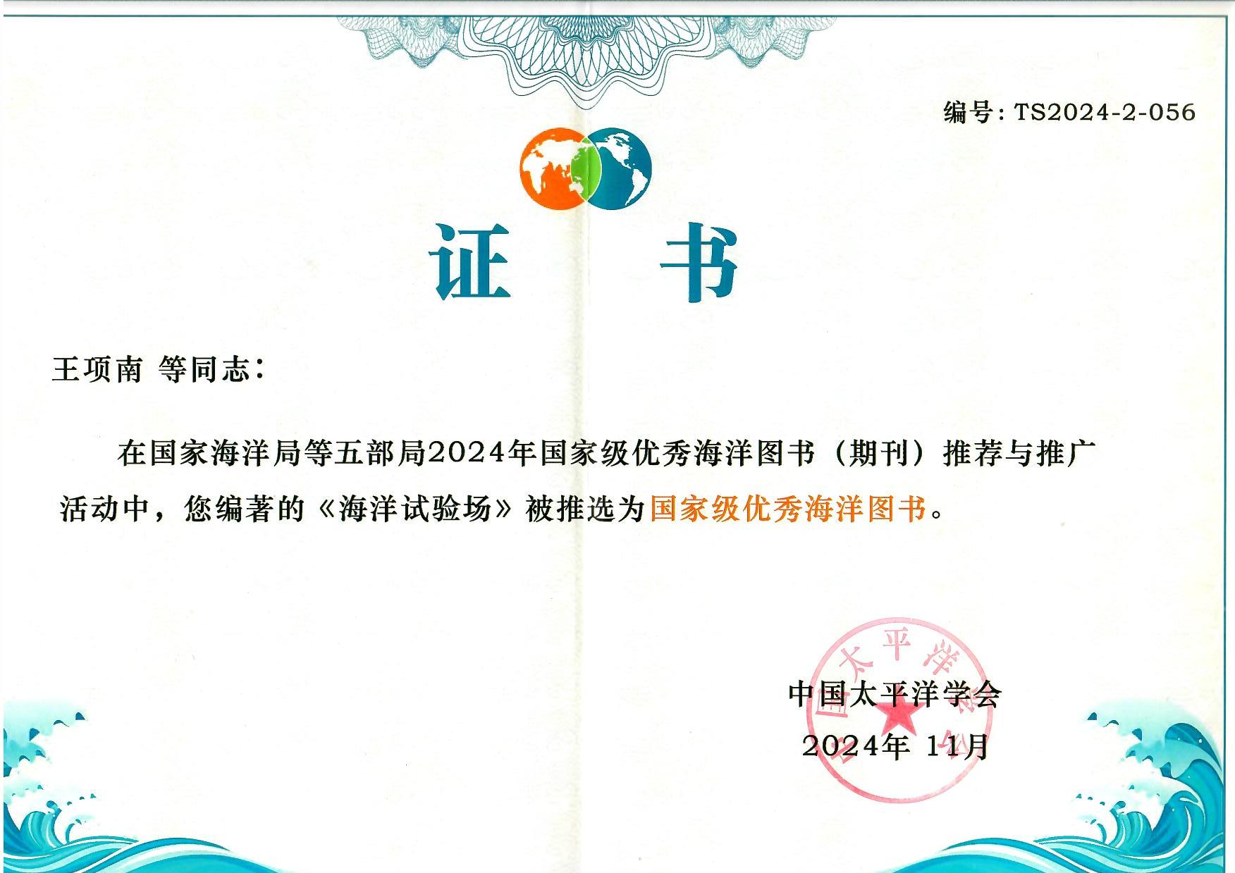 2024年11月,在國(guó)家海洋局等五部局2024年國(guó)家級(jí)優(yōu)秀海洋圖書(shū)(期刊)推廣活動(dòng)中,《海洋試驗(yàn)場(chǎng)》被推選為“國(guó)家級(jí)優(yōu)秀海洋圖書(shū)”。(試驗(yàn)場(chǎng)中心 王萌)